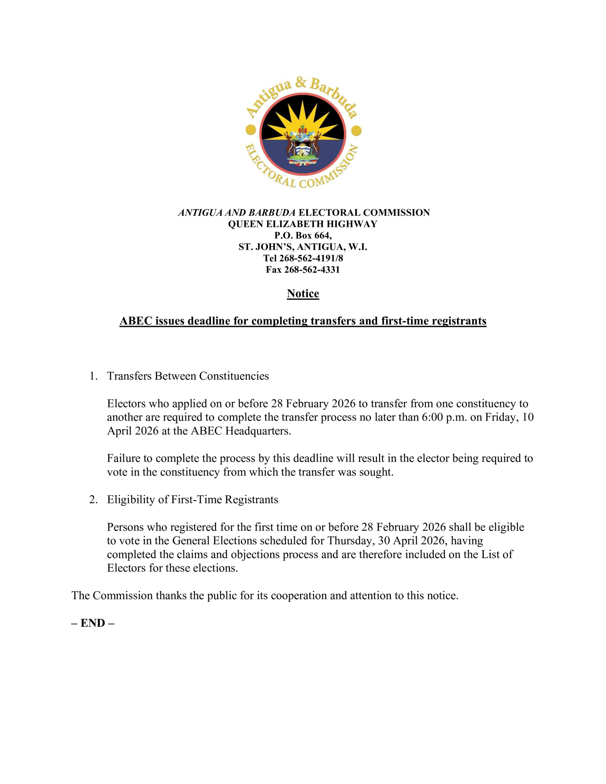 Officials at the Antigua Barbuda Electoral Commission (ABEC) say if you do not complete your transfer to a new constituency by this Friday (April 10, 2026), you will have to vote in your previous constituency.