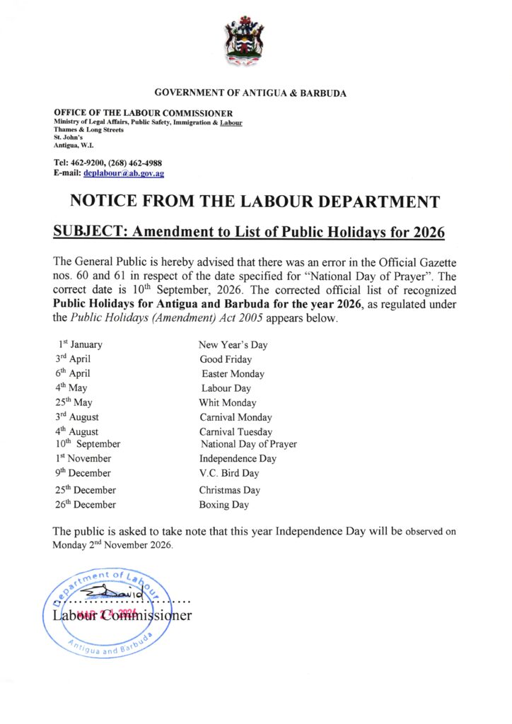 The Labour Commissioner, Eltonia David, has also advised although Independence Day is November 1 each year, this year it will be commemorated on November 2 – this is because November 1 will fall on a Sunday.